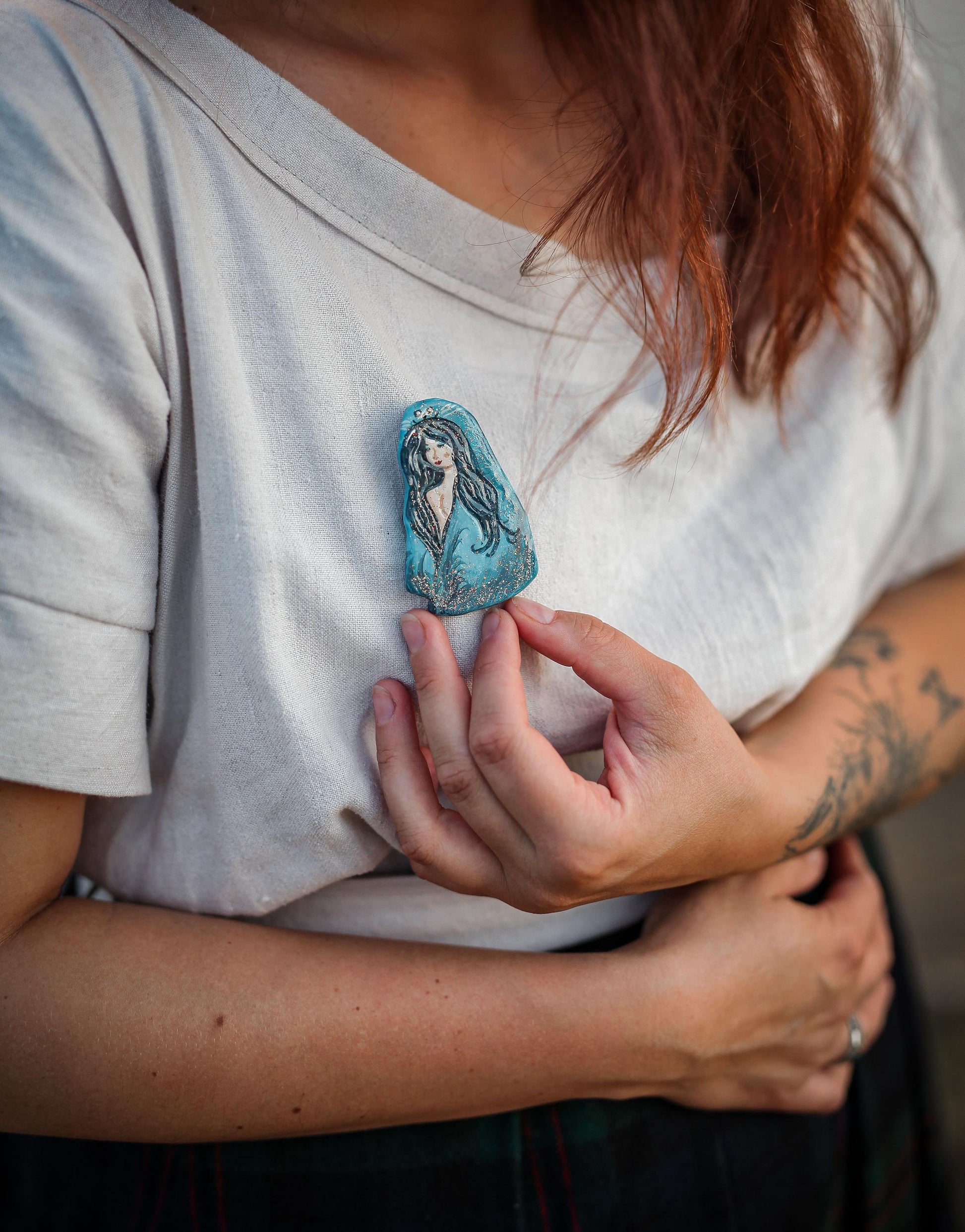 This brooch adds a mystical and elegant touch to any outfit, coat, bag, scarf, or sweater. Made from ceramic modeling clay, it is carefully hand-painted with intricate details and sealed with two coats of varnish. To capture the allure of the Selkie's skin, glitter has been added to both the paint and varnish, making the brooch shimmer beautifully in sunlight. The back features a classic brooch clasp for easy wear.