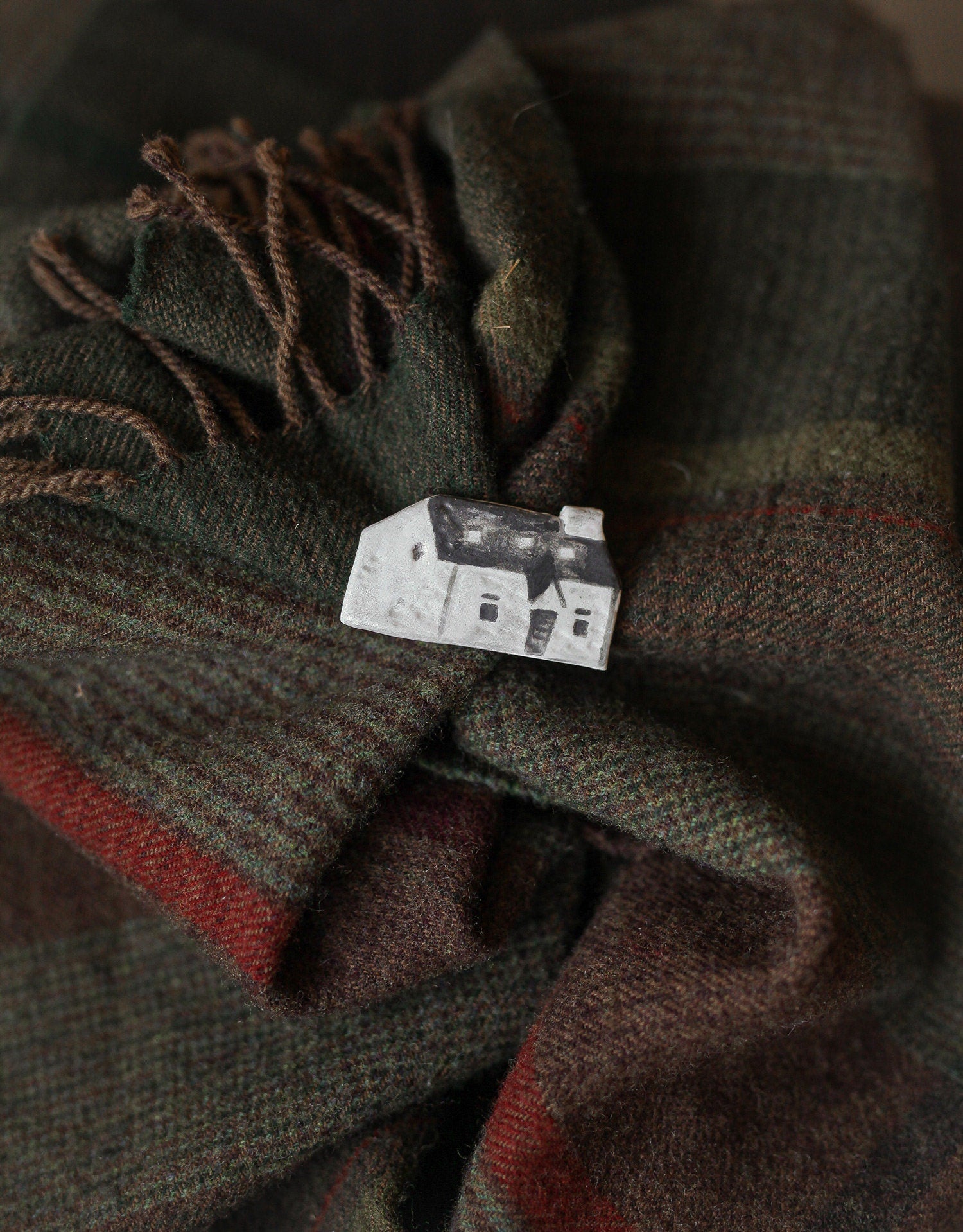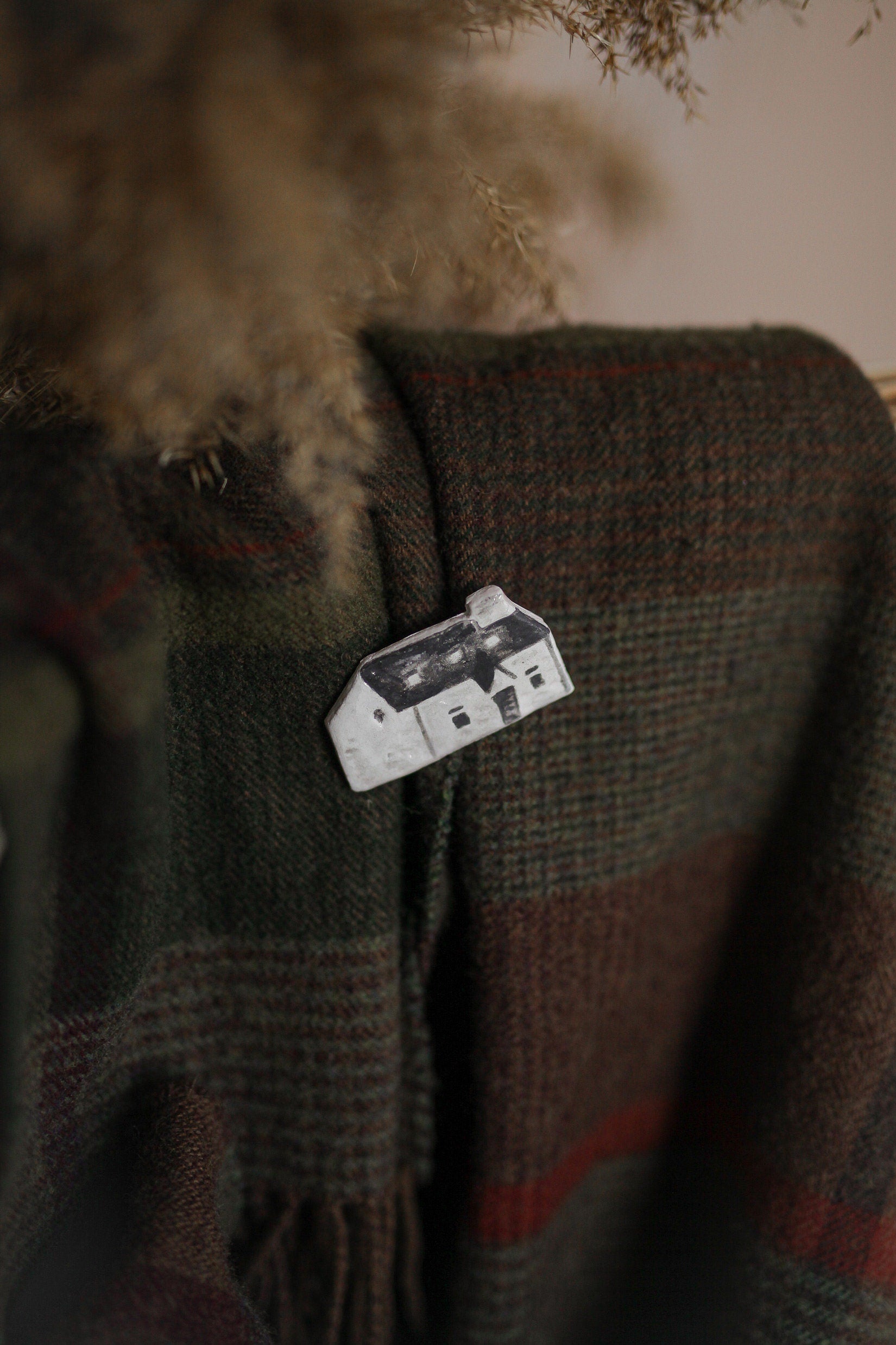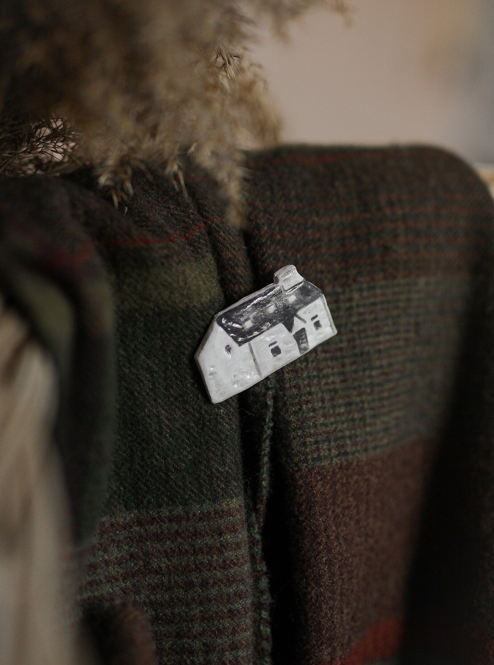 Wee White house of Glencoe brooch which design is inspired by Lagangarbh Hut located in Glencoe Scotland.